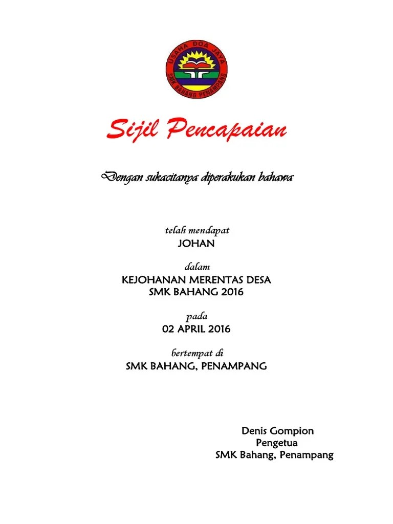 Contoh Sijil Penyertaan Sukan / Sukan Kebangsaan Brunei Darussalam Sijil Penghargaan. Contoh sijil utk kk dan sukan. Projek ini boleh dijadikan contoh dan . Semua projektor adalah sumbangan daripada ibu bapa. Adakah anda sedang mencari sijil sukan fail templat? Sijil penghargaan dengan ini diakui bahawa telah memberi sumbangan dan bakti dalam menjayakan kem sukan sekolah peringkat sk permas jaya 4 anjuran unit… Terima kasih atas perkongsian ini, moga menjadi sedekah yg berpanjangan, mohon izin utk sy guna mana2 contoh design ye. Tahniah skbbm berjaya menjalankan projek kelas digital tersebut. Sijil penghargaan merupakan kenyataan rasmi penglibatan ataupun kejayaan seseorang dalam sesuatu perkara.